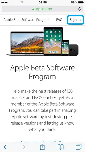 1. Grab your iOS device and open a new Safari tab, or tap on this link to sign-in to beta.apple.com and download the iOS 11 Configuration Profile.