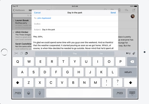 A series of multitasking options have been added to iPad. They help out in using the large screen more efficiently, by performing two actions in the same time. With iOS 9 you can: Slide Over, Split View and use Picture in Picture.