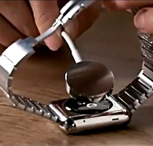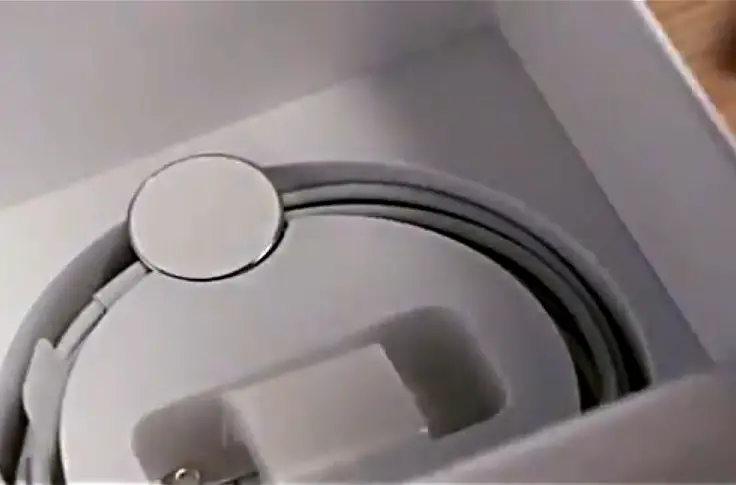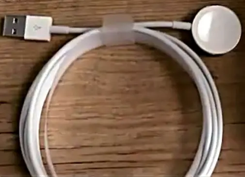 4 – MagSafe charging accessory. It’s a 1-meter long wire, similar to the iPhone’s lightning cable. It comes with a plug for a standard USB port or wall adapter at one end, and a round magnetic disc that attaches to the Apple Watch, at the other end.
