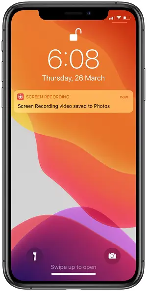 Next: Wake your iPhone and you will find the “Screen Recording video saved to Photos” prompt, displayed on the screen.
