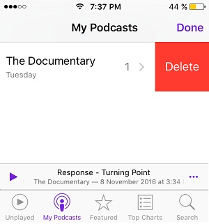 Open Podcasts and browse to the My Podcasts tab. Slide-left on the recording that you want to remove and tap the red Delete label that unveils.