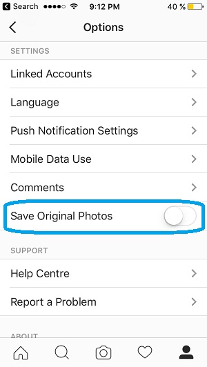 This setting is tweakable from within the Instragram app. Tap the Profile icon available in in the bottom-right corner of the footer menu. Next tap the Settings icon available in the top-right corner of your profile page. Scroll for the Save Original Photos setting and disable it.