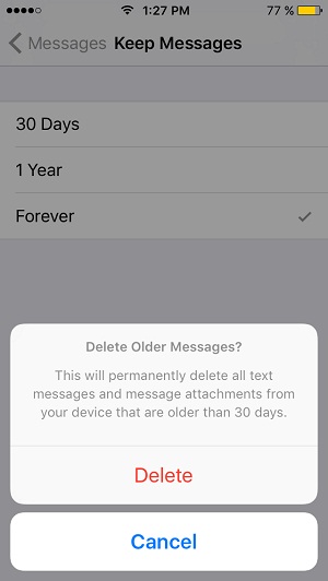 Tip: Visit Settings, open Messages tab and scroll for Message History. Tap on Keep Messages and choose the 30 Days option. Your iPhone informs you that your action will permanently delete all messages and their attachments from your device that are older than 30 days. Tap Delete to confirm and free up space.