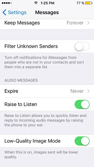 Tip: Open Settings, tap on Messages and scroll for Low-Quality Image Mode. Enable it to save space.