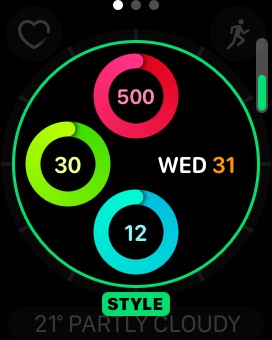 3. Complications: the Activity Watch Faces can host three complications. Two at the top of the screen in each corner and a third expanded view one, centered at the bottom of the Watch Display.