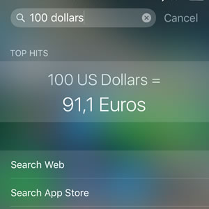 iOS 9 is guessing your needs and automatically provides a currency conversion when you type a currency related input. For example if you travel to Europe and use the search field to type “100 dollars”, your iPhone will instantly provide a conversion to euros. From our test it results that it automatically converts a currency to the one of your current location.