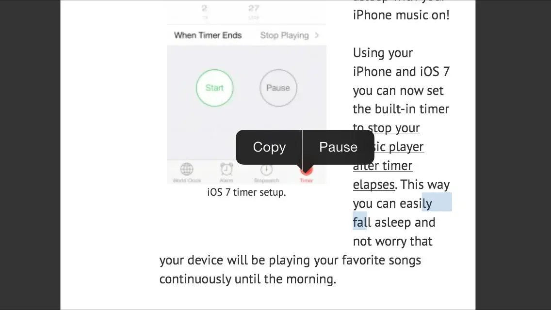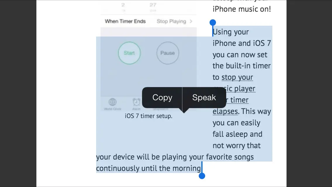 Once enabled and configured, Speak Selection can be accessed by selecting the desired text. This is done by tapping, holding and slowly moving your finger on the paragraph. Now, release and a sentence or a few lines of text will be selected. Tap one of the bars that delimits the actual selection and drag it until the whole paragraph or text turns blue.