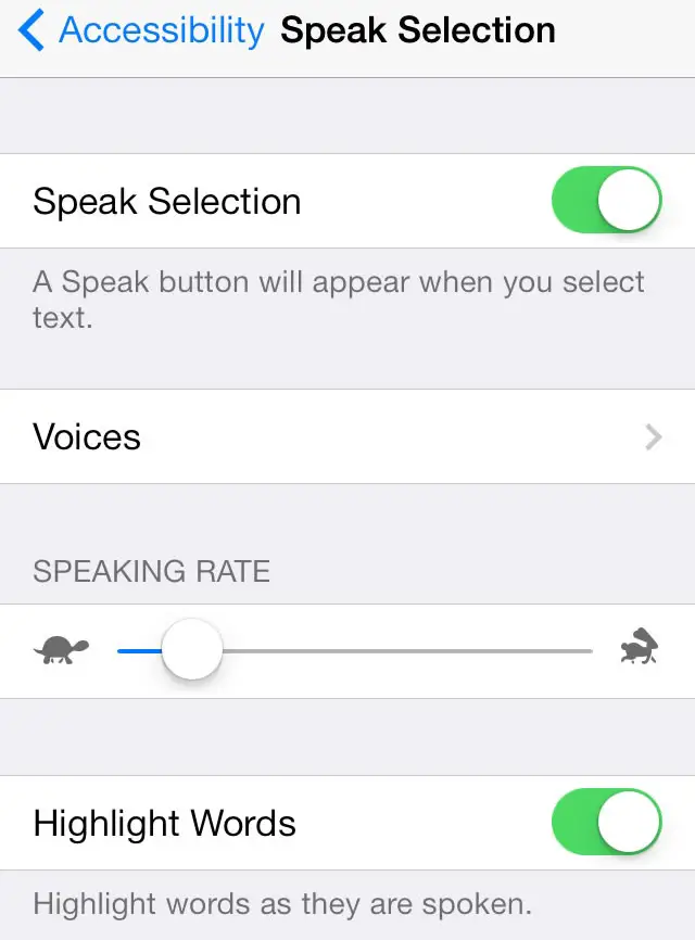 My iPhone 5s did not have this feature activated by default and I assume that this applies to everyone else. To enable Speak Selection simply go to “Settings”, tap on “General”, continue to “Accessibility” and tap “Speak Selection”. Now tap the gray button to enable it and a small menu will drop down, identical to the one presented in the nearby image. This voice reading option can be disabled anytime by tapping again on the on/off button.