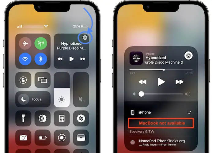 At this point some users claim that the AirPlay quick actions card is blank. The MacBook doesn’t show up in the list, making AirPlay impossible.