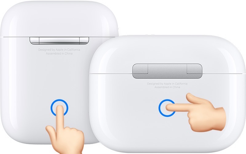 - With the AirPods in the charging case and the lid open, press & hold the setup button, available on the back of the case. Keep it pressed for about 15 seconds.