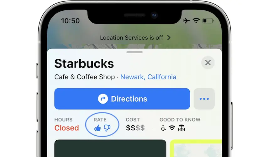 - Tap on Rate, available right below the Directions button in iOS 15.