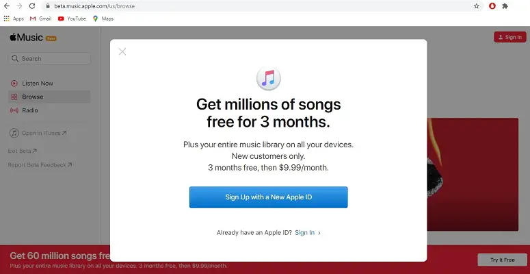 If you’re new to Apple Music you can activate a free 3-month-long membership from the Apple Music website. The freebie works even if you’re a former subscriber that hasn’t used the service for some time. Just Sign Up or Sign In to the Apple Music desktop website and click on the Try It Free banner.