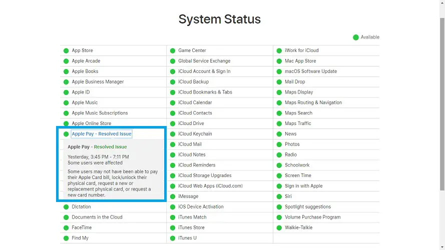 Apple acknowledged the issue yesterday, April 25, at 3:15 pm E.S.T and confirmed that the problem was fixed a couple of hours later at 7:11 pm. You can try to pay your bill as things seem to have been sorted out. Apple’s Service Status page confirms that Apple Pay functions normally. It does confirm that yesterday’s problem was resolved.