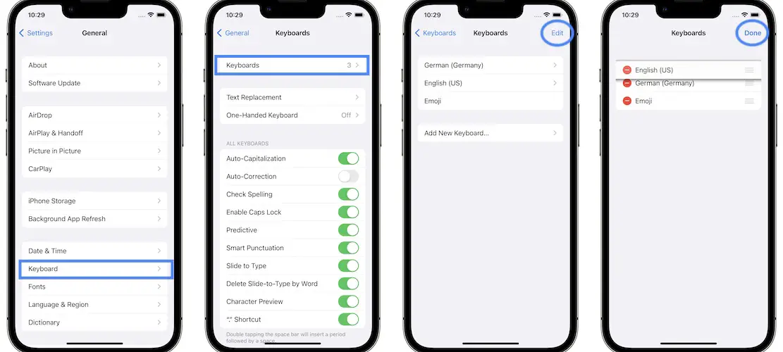 How to: Browse for Settings -> Keyboard -> Keyboards. Here you can use Add New Keyboard… to add English if it’s not already available. Next, use Edit to make English as primary keyboard!