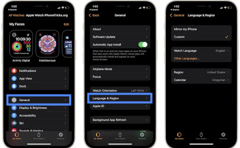 - Tap on Custom and set Watch Language to English and Region to United States.