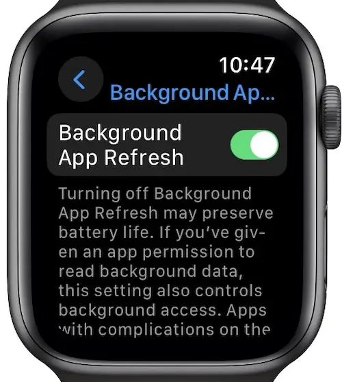 Apps that haven’t been updated with support for watchOS 10 might cause excessive battery drain when running in the background. You can disable this behavior in: