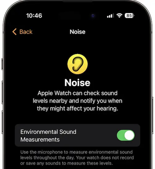 Apple watch can measure the ambient sound levels to detect when you’re exposed to loud noise. A notification is triggered when the decibels can lead to hearing harming levels.