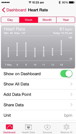 Tap on Show All Data to check how your heart beat at a certain time, during a specific day. If you don’t own an Apple Watch yet, you can still measure your heart rate with good accuracy using your iPhone’s camera, via a third party iOS app like Instant Heart Rate Monitor, for example. Data is collected within the same app, no matter what source you use.