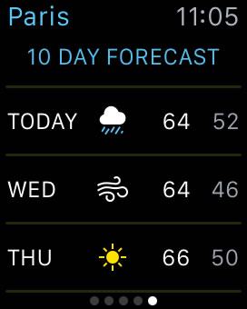 While in the Weather app, Swipe Up or use the Digital Crown to scroll down and unveil the weather projections for the upcoming 10 days. You’ll get estimations about Conditions, Highs and Lows forecast figures.