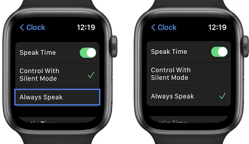 Tip: You can allow the Apple Watch to speak time when Silent mode or Theater mode are ON, by selecting Always Speak in the Settings menu shared above!