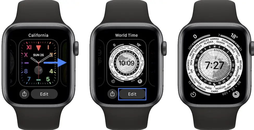 How to: Long-press on the current watch face to enter the Watch Face edit mode. Swipe-left or right to choose a configured theme, or add a new Watch Face!