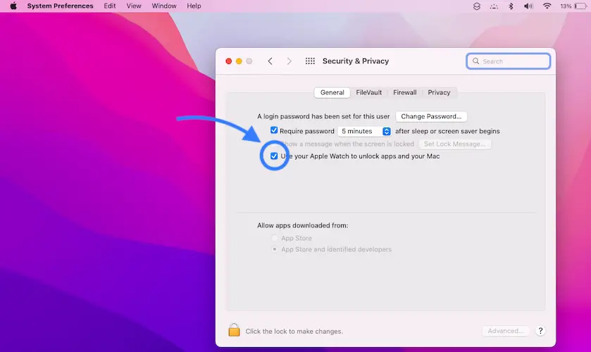- In the General tab, uncheck Use your Apple Watch to unlock apps on your Mac option.