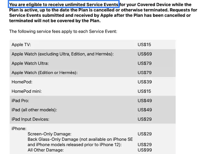 Below you can check a list with the fixed fee that you have to pay for every service event within AppleCare Plus: