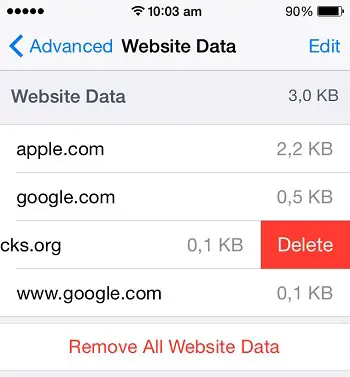 To erase the cache for a particular selection, visit the menu used at option 2. Now, browse the list with website names and search for the page you want to clear cache for. When you find it, swipe-left on its label to unveil the red Delete feature. Hit it and you’re done!