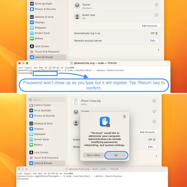 sudo /usr/bin/dscl . -delete /Users/USER_ACCOUNT - 3. Type the account password of the admin user account and hit Return key.