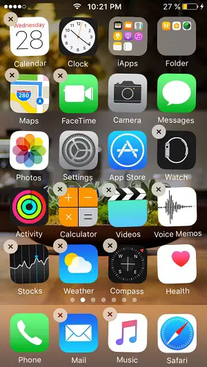 Removing a built-in app is done the same way you erase a third party app that you’ve previously downloaded and installed from your App Store. Simply, tap and hold on the app’s icon until the icon starts to jiggle and an “x” appears in the top-left corner of the app’s logo. Hit it and the app disappears from your Home screen. Press the Home button to exit the application editing state.