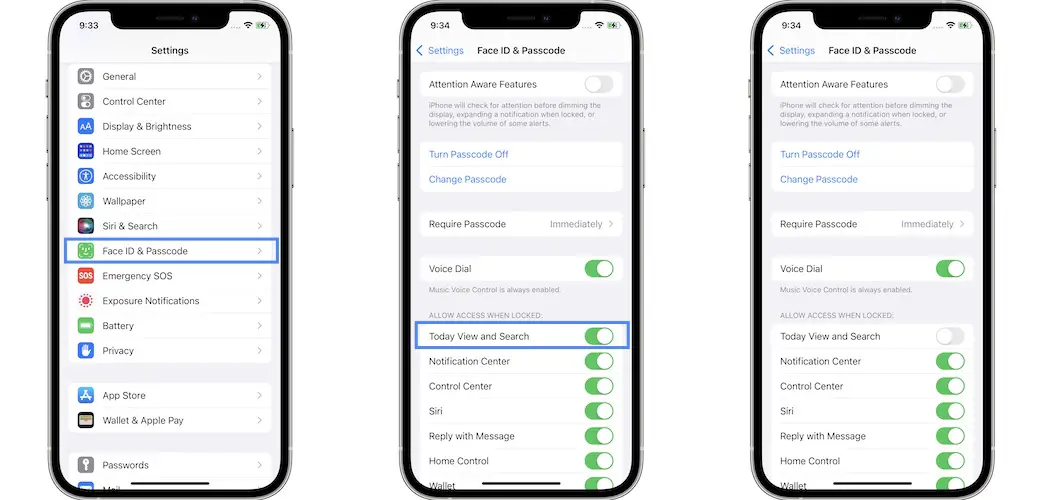 - 4. Scroll for Today View and Search, available in Allow Access When Locked and disable it!
