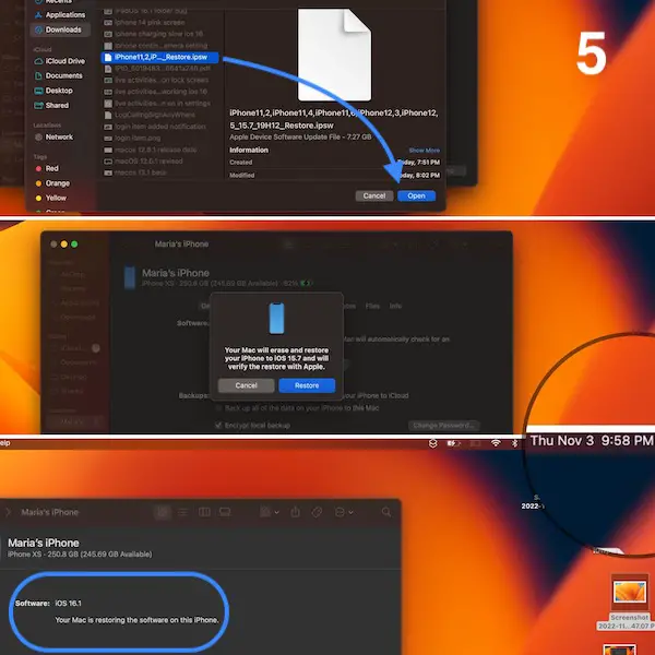 - 6. Select the recently downloaded iOS 15.7 ipsw file, in the dialog box that pops up. Click Open. Click Restore to confirm that you want your iPhone to be erased and iOS 15.7 restored! Be patient until the process completes.