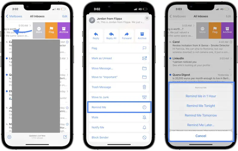 Tip: You can also schedule a Remind Me notification directly from the Inbox view. Swipe-left on the thread and tap More. Pick Remind Me, from the available options, and select the desired time frame.