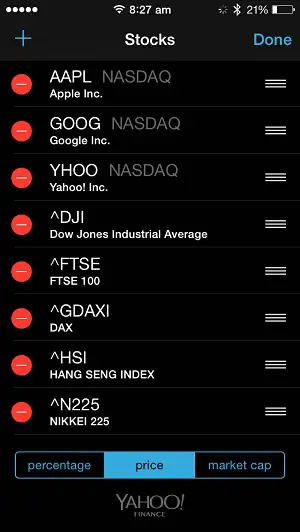 You can tweak, add or remove followed shares from the iOS Stocks app. Open in and tap the bottom-right menu button. Here you can use the “+” icon to search and add a new stock, or press the red “-” icon next to the share’s name to delete it. Tap the drag & drop button to change the order of the companies. The first one in the list, is also the default stock shown on Apple Watch Face and glance view. Last but not least you can also tweak the default unit value to be shown, between: percentage, price and market cap. Return to Stocks home screen, by taping Done.