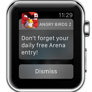 2. No, Angry Birds 2 doesn’t come with Apple Watch compatibility. However, as with all other apps, notifications are sent to your wrist. So, don’t be too surprised if you’re not playing for a while and the piggies start missing you. I just received a call to action notification, which you can see in the nearby print-screen, sounding like: Don’t forget your daily free Arena entry!