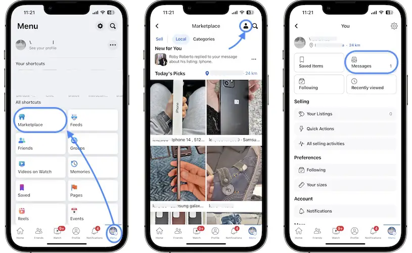 - B.Open Facebook app, if Marketplace isn’t available in the footer, tap on Menu in the bottom-right corner of the screen -> Tap Marketplace -> Tap the ‘person’ icon in the top-right corner of the screen -> Tap on Messages -> Review your chats in the Marketplace Inbox!