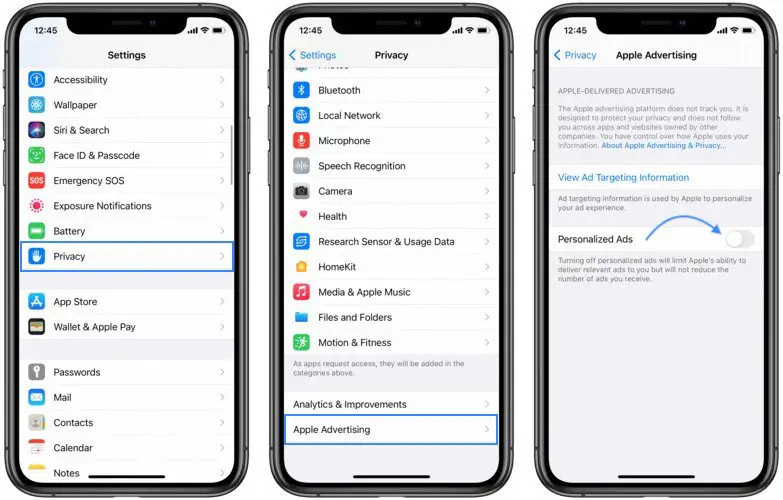 How To: Open Settings and browse for Privacy -> Apple Advertising -> Personalized Ads.