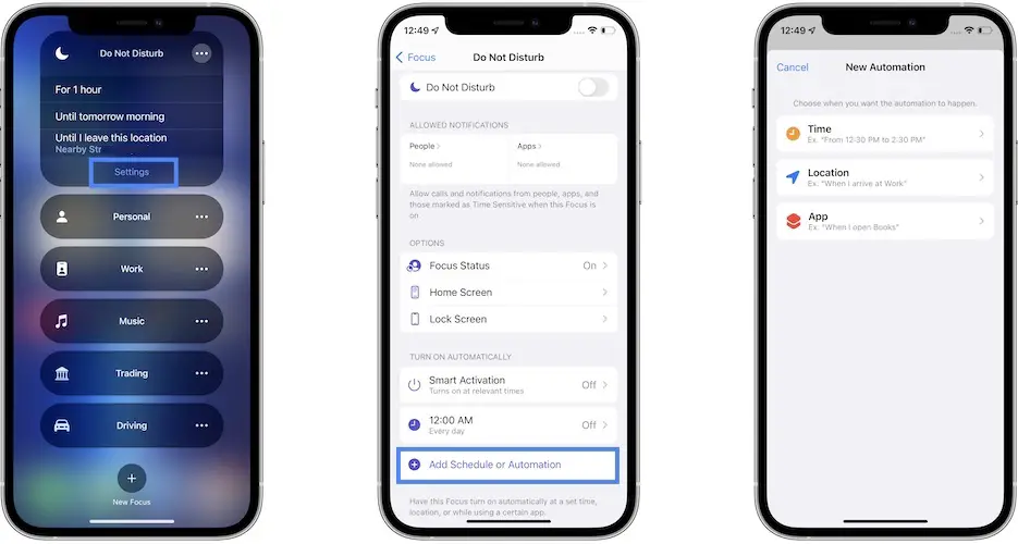 In the Do Not Disturb quick actions menu, from Control Center, opt for the default 1 hour timeframe, or tap Settings and add a Schedule or an Automation.