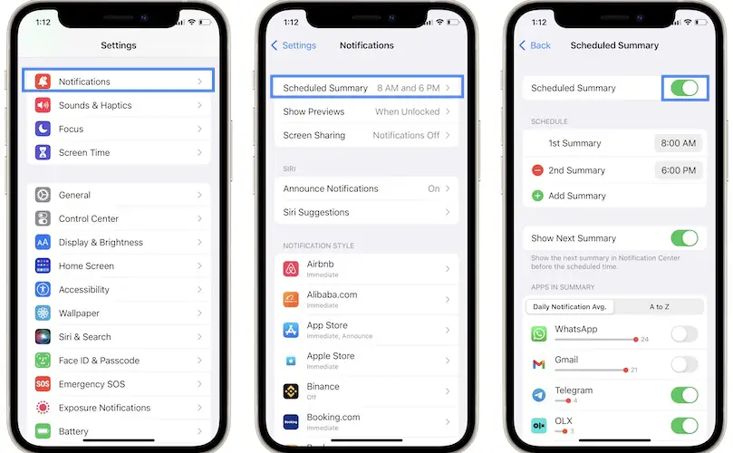 Tip: Later on, try to open Settings and browse for Notifications -> [App Name] and switch back from Scheduled Summary to Immediate delivery! Also make sure that Time Sensitive Notifications are turned ON! Finger on, for the Leave ON notification to stay away!