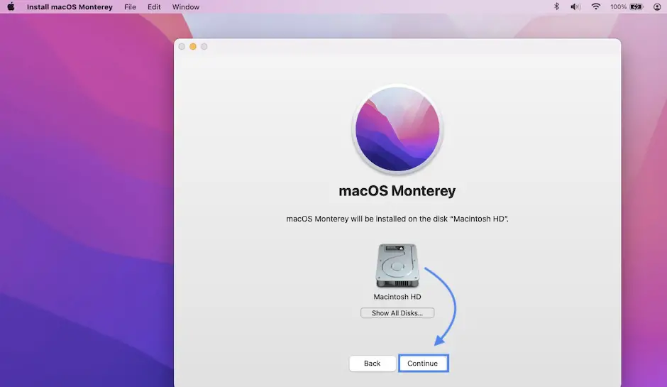 This happens after clicking the ‘install macOS Monterey’ file. You click Continue and are prompted to select the drive that you want to install macOS 12 on.