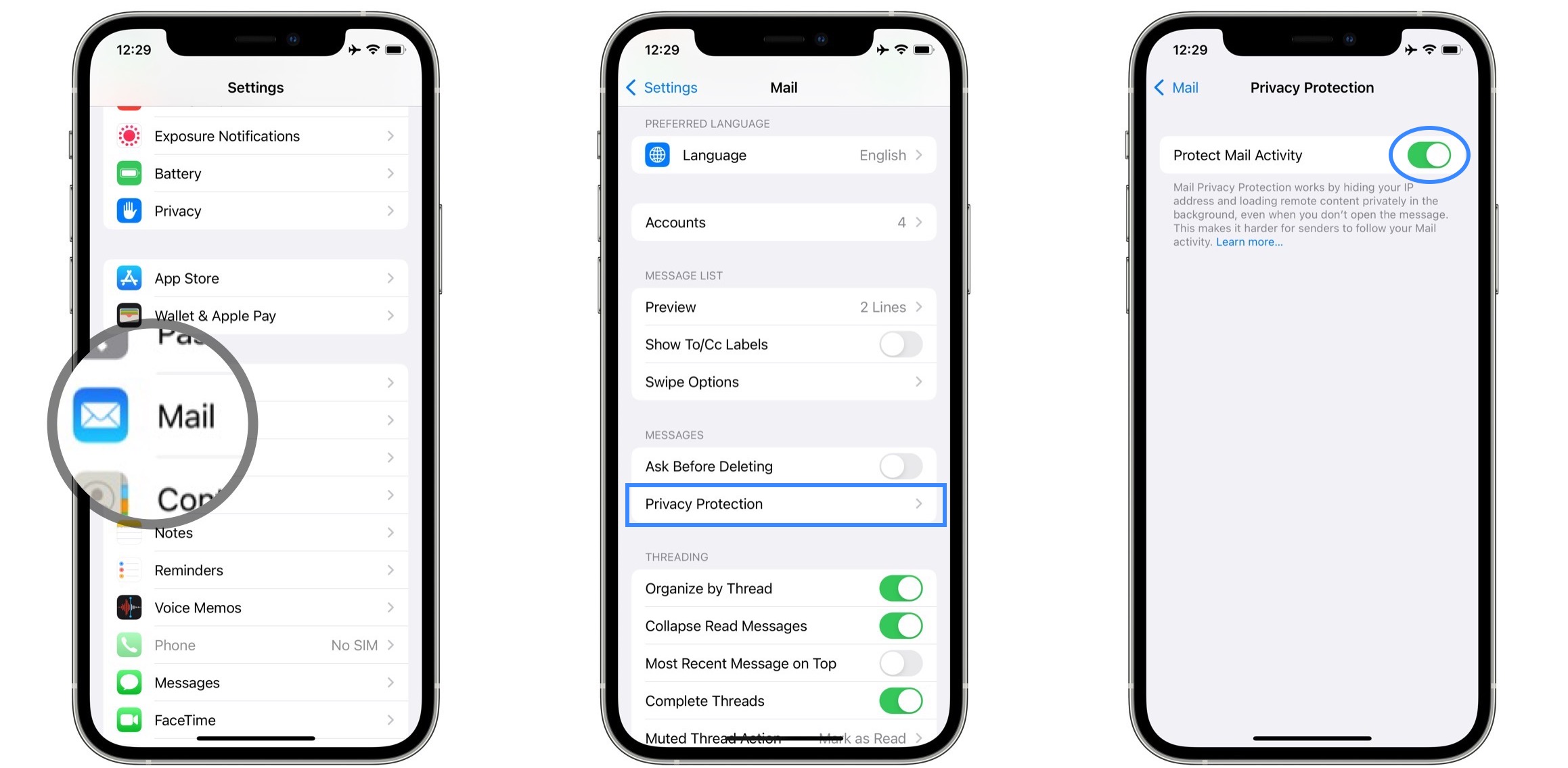 How to: Browse for Settings -> Mail -> Privacy Protection -> Protect Mail Activity. Turn it OFF and also disable Hide IP Address option.