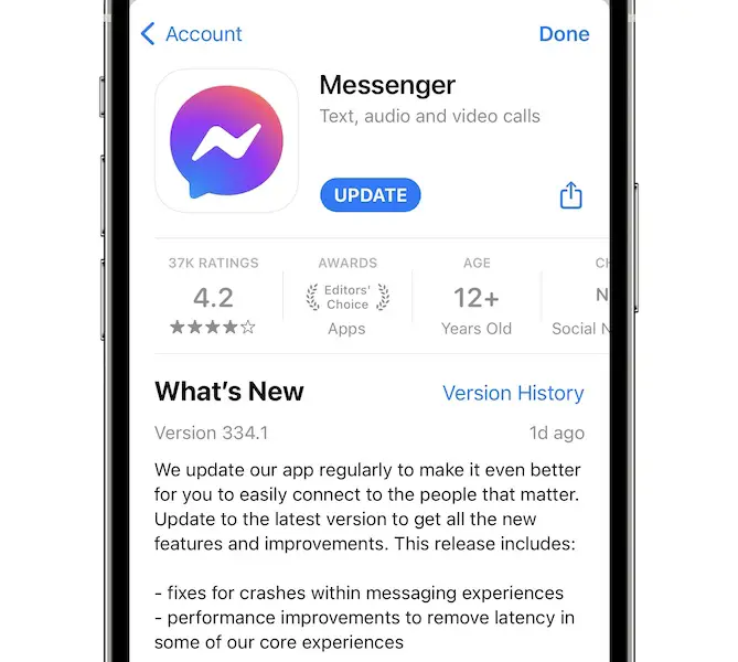 To update, open App Store, tap on your Profile icon (top-right corner) and tap the Update button available next to Messenger.