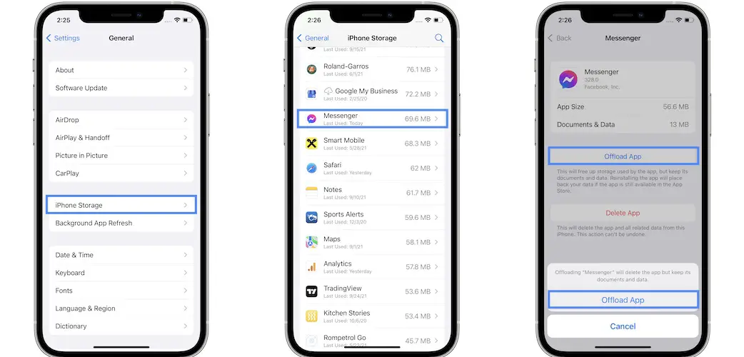 How to: Open Settings -> General -> iPhone Storage -> Messenger. Tap on Offload App. Use the Reinstall option to get the app back in no time!