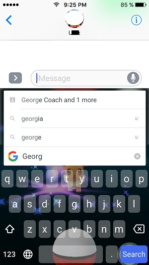 – Search and Share Contacts: allows you to search for your iOS contacts when taping the colored G button available in the top-left corner of the keyboard. Type the keyword, in this case the name of the contact and the first hit is a contact result, followed by other Google search suggestions for that specific keyword. Once found, you can also share your contact with the help of a message.