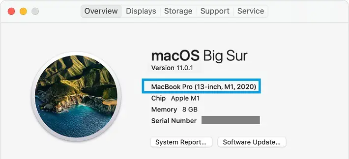 To quickly verify the exact model of your machine tap the Apple logo, available in the top-left corner of the screen and select About This Mac. In the Overview tab, below the macOS Big Sur version, you can find the exact Model of your device, as well as info about Processor, Memory, Graphics and Serial Number.