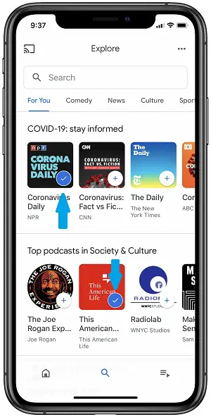 – Browse the collections that are already available in the explore tab. You can choose from: Top podcasts in Society & Culture, Comedy, Popular & trending, News & Politics, Sports & Recreation, Education, Business, Technology, Arts, Health, TV & Film.