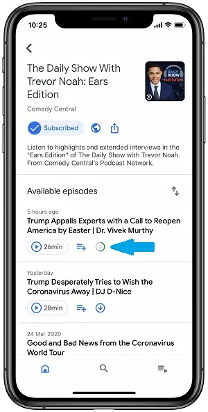 1. Tap the downwards-pointing icon next to the episode’s title to grab the file and play it offline later on.