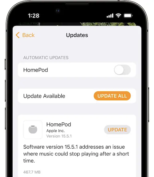 - 4. Tap Update All, after HomePod 15.5.1 pops up.