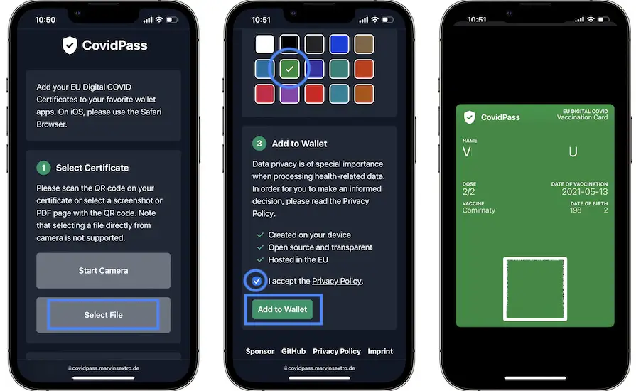 - covidpass.marvinsextro.de (Advertises as ‘Created on your device’, ‘Open source and transparent’, ‘Hosted in the EU’)