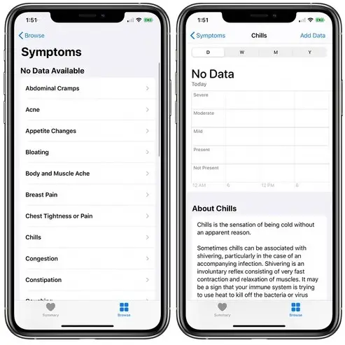 Fact: All the symptoms available in the Health app are accompanied by a clear description to make sure that you can properly determine the ailment that you’re enduring. Potential illnesses associated with the symptom as well as causes and effects are also mentioned.